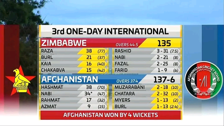 তৃতীয় ও শেষ ওয়ানডে ৪ উইকেটে হেরে আফগানিস্তানের কাছে ৩-০ তে হোয়াটওয়াশ হলো জিম্বাবুয়ে।